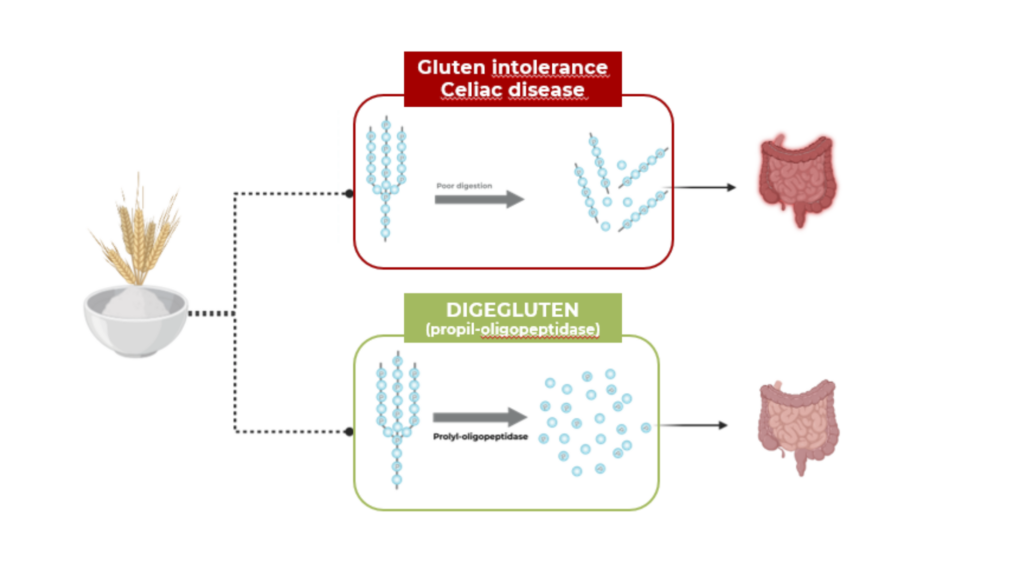 Prolyl-oligopeptidase has been shown to significantly reduce gluten epitope concentrations in the stomach and duodenum. This suggests it may help gluten-intolerant individuals manage symptoms and reduce the impact of accidental gluten exposure.