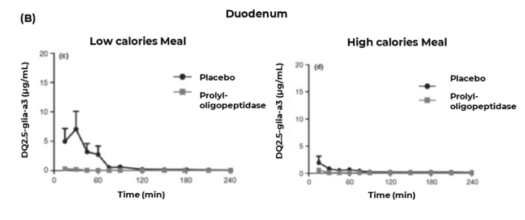 (A) Prolyl-oligopeptidase significantly reduces gluten epitope concentrations in the stomach of healthy individuals. (B). Prolyl-oligopeptidase significantly reduces gluten epitope concentrations in the duodenum of healthy individuals