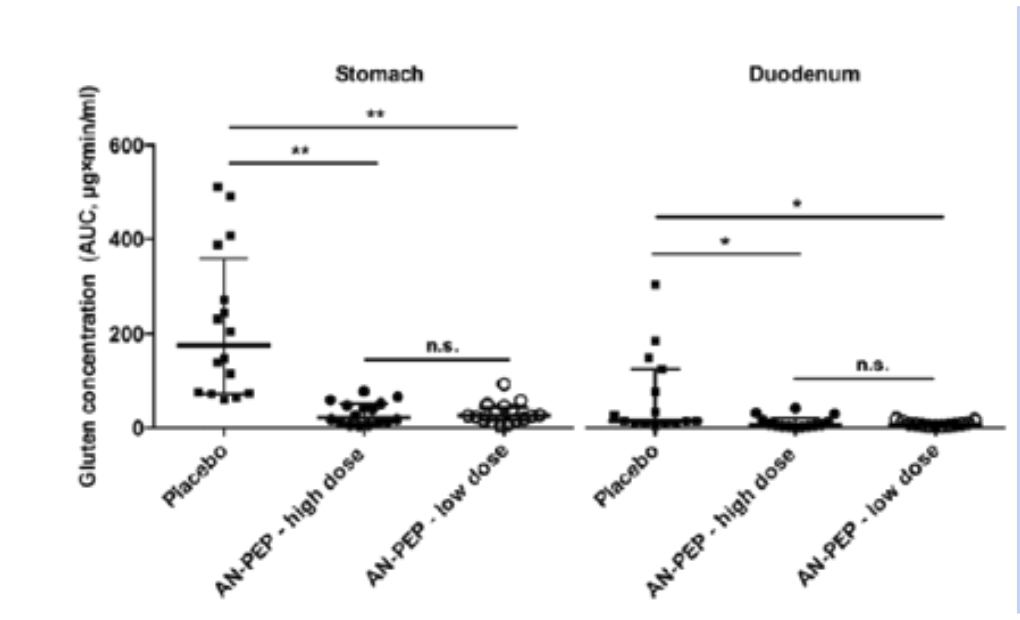 The results from this double-blinded, placebo-controlled study showed that both a low and a high dose of AN-PEP in the form of tablets significantly reduced the gluten concentrations in the stomach and duodenum of gluten-sensitive individuals.